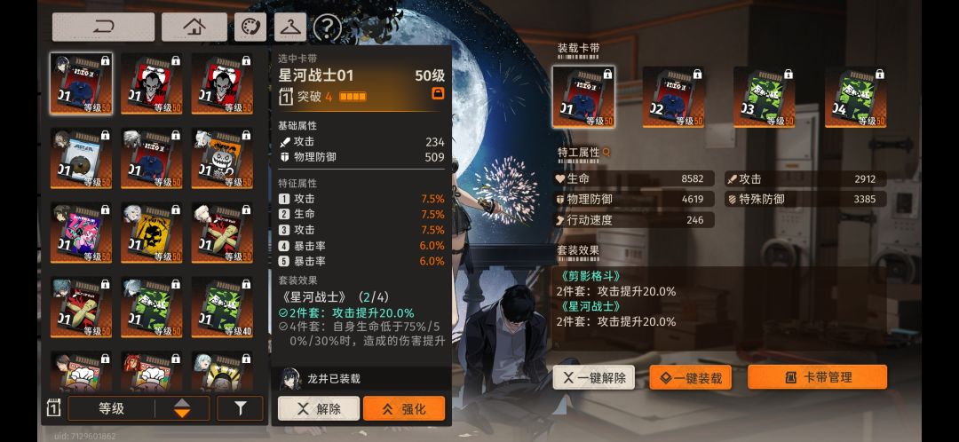 先说结论!龙井是目前1.0版本相当强力的单体物理C!推荐抽取。 1重门时也可以作为群体C用,不过效果肯定不如真正的群体C。 0重门时,且在常规情况下,推荐在配队里补一个群体C,如净天、千秋等 另外,龙井很适配四星辅助绿雪,打险境时月白可以腾给另一路。 一、卡带选择: ①携带剪影格斗四件套。 ②2件套的《剪影格斗》+2件套的《恶灵公馆》,最大化角色攻击值。 二、配队: 按照辅助或治疗+单C+群C+治