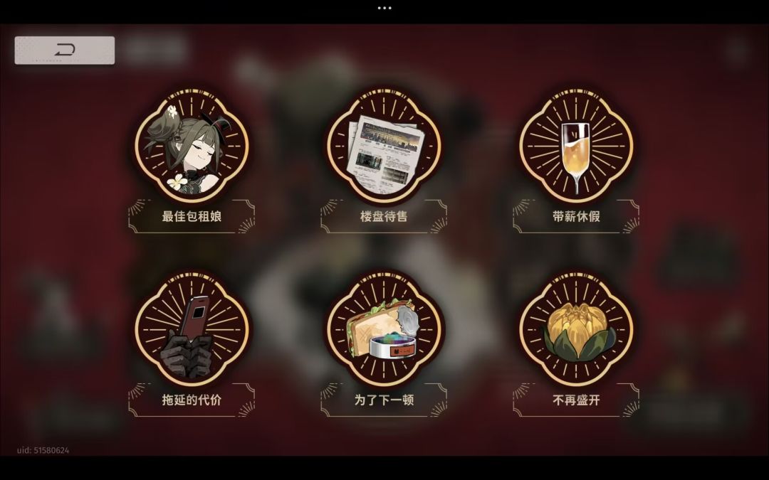 前排提示: 由于官方修复之前结局文本bug导致“为了下一顿”和“不再盛开”结局对调了,本帖更新了修复后的,对11月21日16时30分前完成结局收录的无影响 ———————— 结局:最佳包租娘,获得道具“楼盘图纸” 第一天上午商场接任务 第三天下午地下 第四天上午商场 第五天上午居民区 结局:拖延的代价 不做任务到处瞎逛或者战斗全跳过失败即可 结局:带薪休假 需要完成和家泉的捉迷藏,获得“售楼手册”