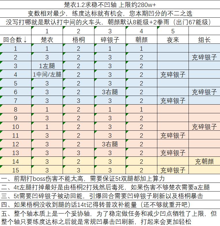 梧桐自身技能带20%暴击,用无主卡带自带26%暴击,四张卡带词条可以有12个位置洗暴击6%属性,其中9个位置洗暴击率=54%,那么在没有辅助角色的情况下,暴击率就100%了。而碎银子作为主要上毒的角色,只要把攻击尽量洗高就行,剩下两个位置其实不用上专业拐了。楚衣作为大概率延长一回合毒的作用其实是很大的,她奶量又足够,另一个位置是否可以上骐骥,因为他能施加很多的debuff,有效减弱和控制怪物的同时