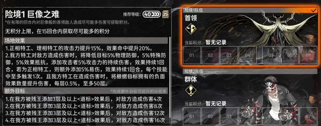 险境复现两队分数打满60W即可领完所有奖励,冲榜仅给头像框,请各位组长量力而行不要上头 关注新月同行wiki谢谢喵 残王,木桩一个 机制说明: 残王的技能类似于恒沙,群体伤害和随机伤害,伤害后给我方添加一个道标,类似于碎银子的毒,有道标的我方动回合会掉血,道标层数越高,攻击类增益越高,但扣血越厉害,道标只能通过治疗来消去。 打法: 额外分不好打,直接嗯吃基础分 1、3保1碎银子,此处排轴龙井替换成