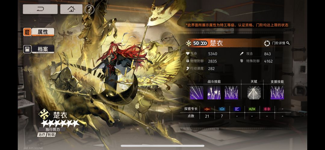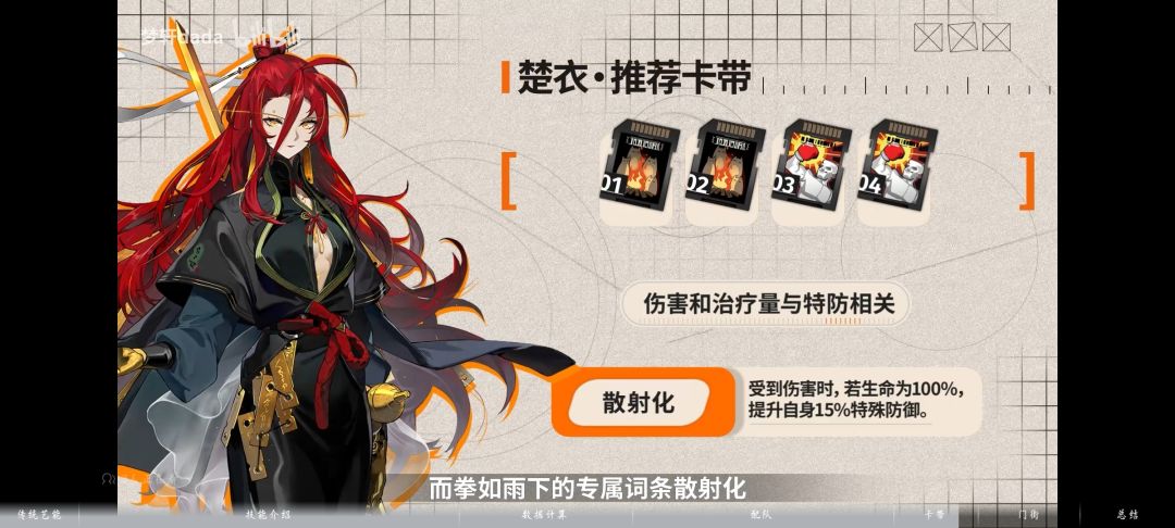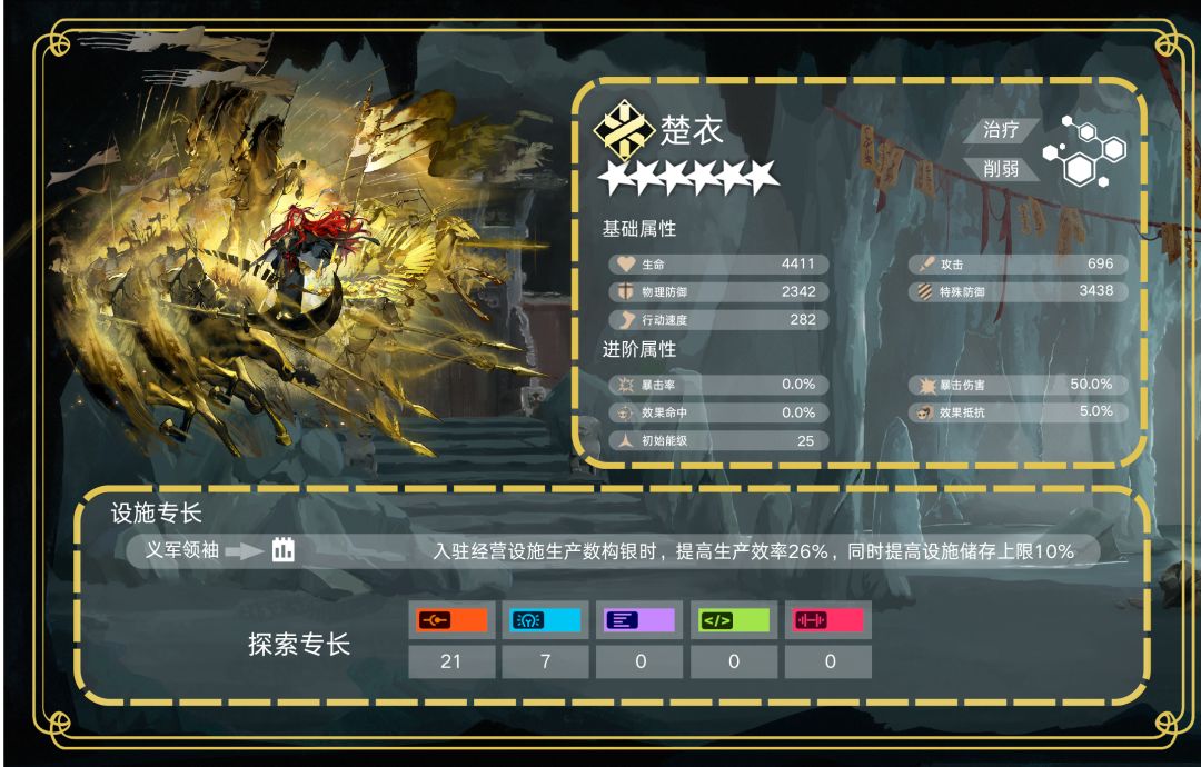 首先,楚衣并不适配所有队伍,输出比较少。我也不推荐新手直接抽,说实话,放在寻常队伍里面,很弱。 现目前险境复现下半大多数都用的净天,刺灰,碎银子用得比较少,碎银子也不会因为楚衣假如强度爆炸 定位:奶+副C 虽然2无主+2红月都能奶2600,但是现目前的游戏环境对于全体治疗的要求并没有那么高。 值得注意的是,楚衣的战术技能和超限技,伤害数值一模一样,能级消耗一模一样,只是战术技能是伤害,超限技是治