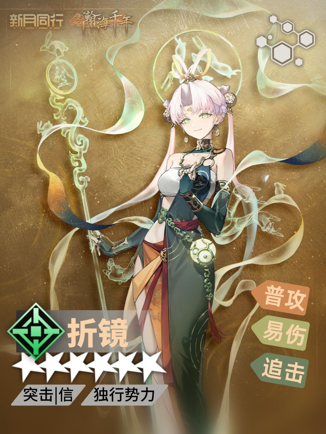 #新月同行瀚海千年 #新月同行 #新月同行攻略 #游戏种草计划 #瀚海千年 tada~这里是小丸! 新月同行迎来了1.1新春版本啦! 本期带来的是新春限定角色的养成攻略! 角色:『折镜』 星级:☆☆☆☆☆☆ 灵感:突击&信 阵营:独行势力 定位:易伤&引动&普攻体系 1⃣角色定位2⃣养成材料3⃣卡带推荐 4⃣技能解析5⃣设施专长6⃣认证介绍 7⃣抽取建议8⃣配队思路9⃣门阶建议 等角度全面给出参