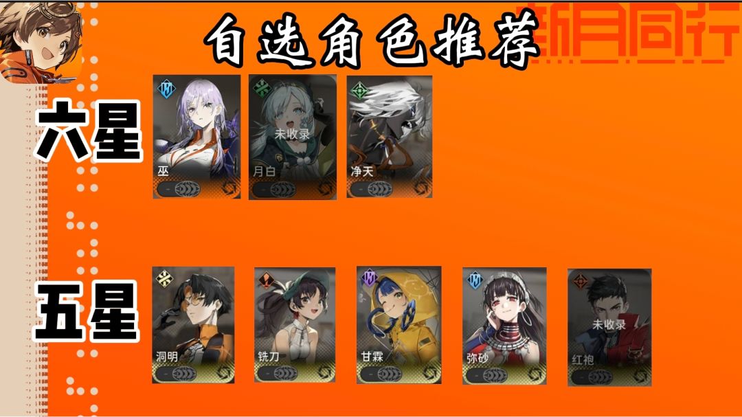 定向一定要认真选,不要按照强度乱选 xp第一,xp第一,xp第一 一怎么选 1按照自己抽到的角色来选 比如: 抽到了巫,那么自选我就选输出 新手卡池抽到音希,自选可以选巫/月白 2缺什么选什么 比如: 抽到巫+龙井,没有朝颜,可以选月白 只抽到输出,比如龙井,但是有甘霖/银峰,没有好用的奶妈,也可以选月白 主要的思路就是,缺什么选什么。 非常推荐:月白 推荐自选角色,鸦,月白,净天,巫 如果角色都