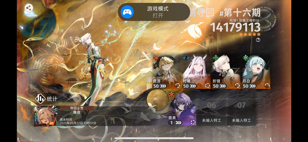 先说说这关特点:甘霖会单体援护,所以没办法上弥沙打持续压制;家泉奶量巨高,要么核爆要么群伤,但是我1门净天也还是伤害不够,会被奶回来;结会降速,伤害也挺高的;白槿会压制,伤害也高,对站位和清buff有要求。 阵容:启航,月白,恒沙,朝颜,支援夜来 门阶:启航劲量高门,月白0门也行,恒沙1门(0门没试过),朝颜4门 卡带:启航4高墙(因为我只有这套);月白2+2生命;恒沙4无主;朝颜2+2攻击 流畅