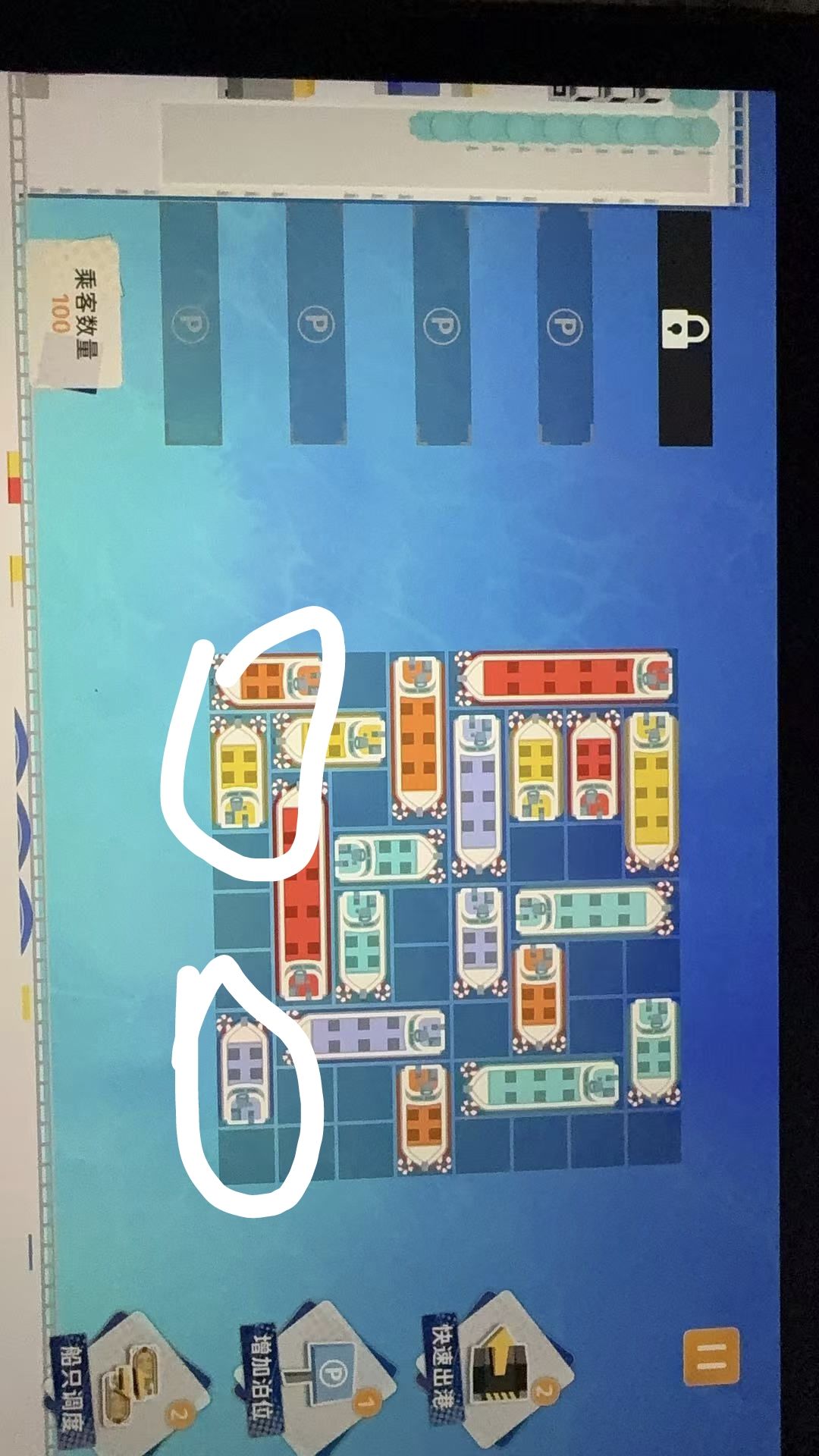 记住!开局不要点蓝船,把最下面角落的两条挡道小船开出去图1,然后再开两条蓝船,之后把下面小紫船和右面小橙船开出去图2,然后把小号小黄船和最上面中黄船开出去图3,然后再把最右边挡道蓝船和中间紫船开出去图4,剩下的就随便点就过了,不用谢!!