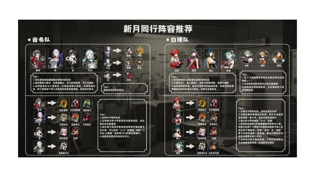 开服老毕登一枚,最近看好多萌新小白问各种搭配,心血来潮就想写这么一篇自己的心得。将从几个方面来全面解析各种养成攻略。 一,配队。先了解#新月同行 里几个职业区别 #强攻=物理输出且大部分都是单体输出。有些能带溅射。#特攻=可以理解成魔法攻击,大部分都是群攻。#突击=副c+辅助 大部分突击都不好用,限制比较多,但是好用的也是很强 比如折镜泛用性超高#防护=基本分为上盾,援护和分摊,金桂的群体上盾泛用