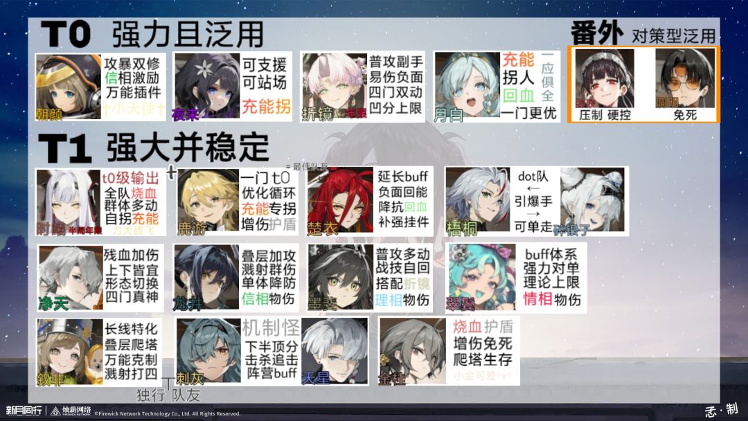 朝颜 综合评价:yyds 分析:buff能叠层,0门即可提供60%攻击和40%暴击,4门后可提供90%攻击和60%暴击。 加上被动治疗,无可替代的最强辅助。玩过白荆的可以理解为芙蕖+同行定位buff辅助 抽取建议:强烈建议4门,5星定向必选阵容搭配任何队伍都有她的一席之地 支援位:夜来 卡带搭配:拳如雨下2+攻击2,副词条初始能量拉满 技能升级优先度:2技能拉满 千秋 综合评价:输出T2 分析:白