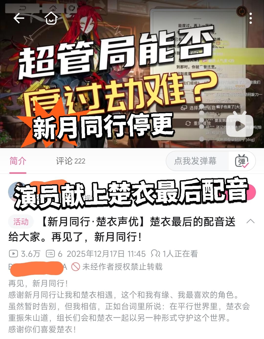 👀新月同行停更由深圳市烛薪网络科技有限公司研发的新怪谈题材回合制手游《新月同行》 在刚过一周年之际,在即将迎来属于自己的新年全新版本时官宣停更,相关信息引爆玩家讨论,成为近日以来的游戏圈的一则热点新闻。👀演员献上楚衣最后配音近日,有对游戏暴似感到不舍的玩家们,力所能及的为游戏产出二创内容进行留念其中就包括角色楚衣的配音演员据悉,该配音演员发布相关视频,宣布将楚衣最后的配音送给大家配音老