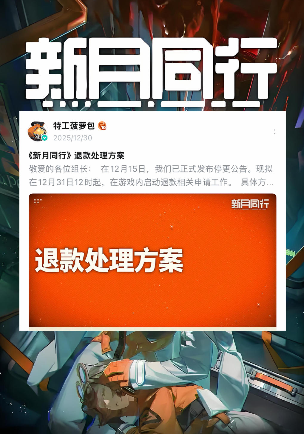 《新月同行》发退款公告了,之前说不更了还挺突然的。官方的说法是,从2025年9月16号到12月30号这期间充了钱,而且账户里超相金比用掉的还多的玩家,就可以申请退款。退款有两个选择,一个是直接退现金,另一个是换成周边,但是只能选一个。想换周边的,礼包里有角色立牌、鼠标垫、徽章这些,不过官方也说了,这些东西没有售后,坏了不给换的,选现金的就直接等钱到账。申请时间是从12月31号中午12点开始