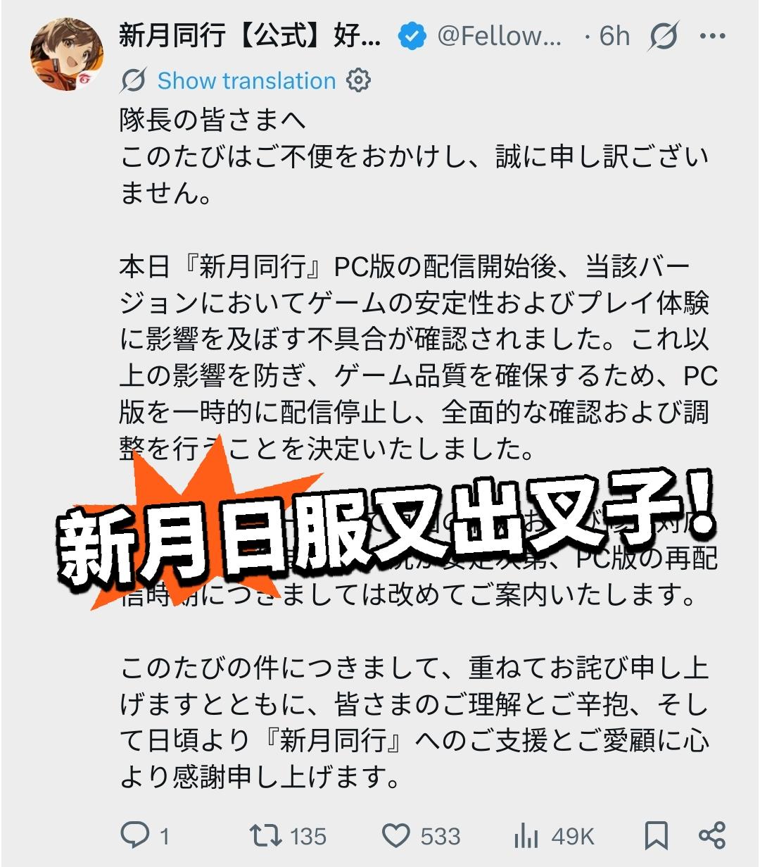 众所周知,这款国产游戏《新月同行》在2024年10月24日正式公测,但运营418天后,又于2025年12月15日宣布停更了。但是,就在今天(1月5号),《新月同行》日服又发布公告说是要出PC版了!怎么回事呀?正统国服都停止下载,停止充值,停止更新,退款方案都出来了。怎么日服却似乎风生水起的样子,都要准备出PC版了。有点意思哈……一般来说,假如某个游戏国服要是快