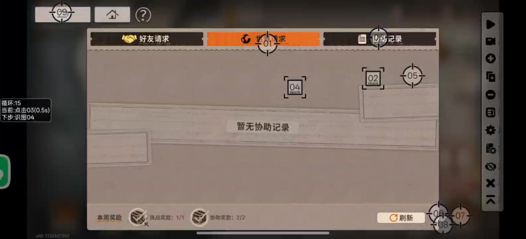 用了一个app,超级点击器,编了个点击程序,自动刷新世界请求,自动进游戏,打完自动退出,并继续刷新。我用的千秋,可以用一个1级人,作战时间还能缩短点。 视频为一个完整循环。 要是每周可乐的协助奖励更多点就好了,唉。。。。 B站上有这个app的介绍。