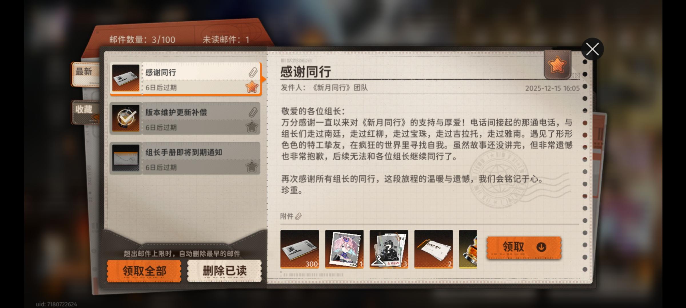 敬爱的各位组长:万分感谢一直以来对《新月同行》的支持与厚爱!电话间接起的那通电话,与组长们走过南廷,走过红柳,走过宝珠,走过吉拉托,走过雅南。遇见了形形色色的特工挚友,在疯狂的世界里寻找自我。虽然故事还没讲完,但非常遗憾也非常抱歉,后续无法和各位组长继续同行了。经过项目组审慎的考量,我们非常遗憾地宣布:《新月同行》将于2025年12月15日版本更新后,停止更新。停更后,组长仍可正常登录。从立