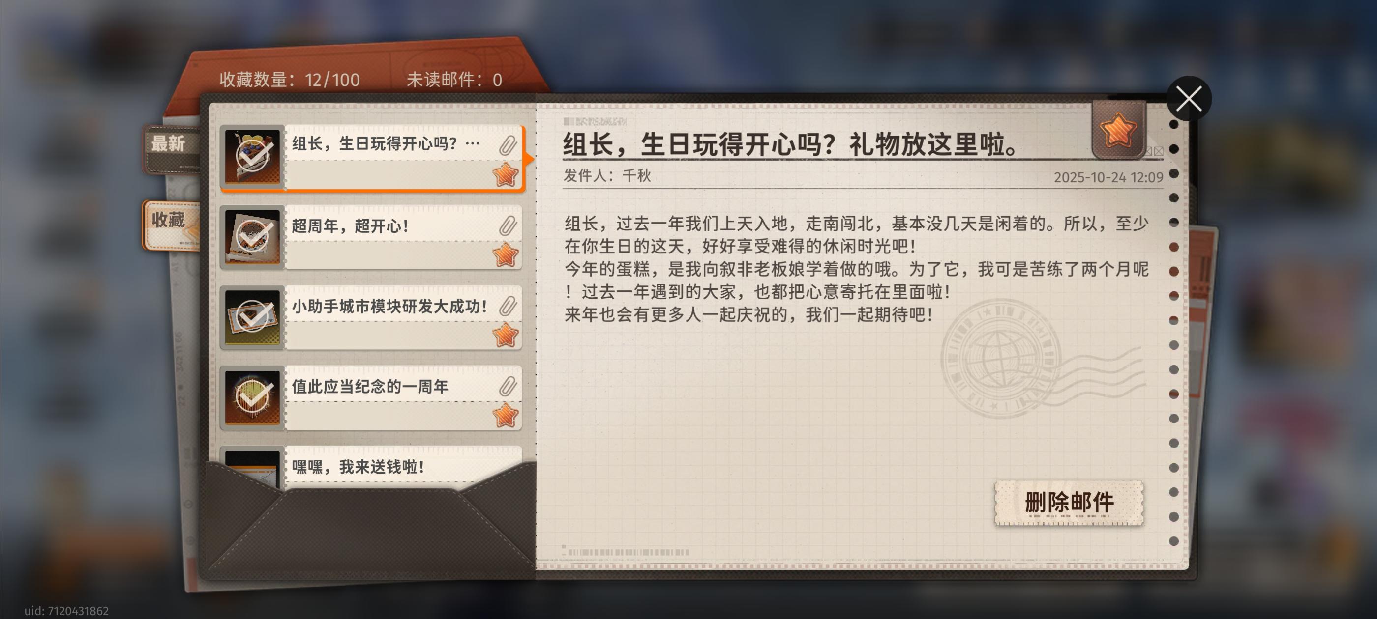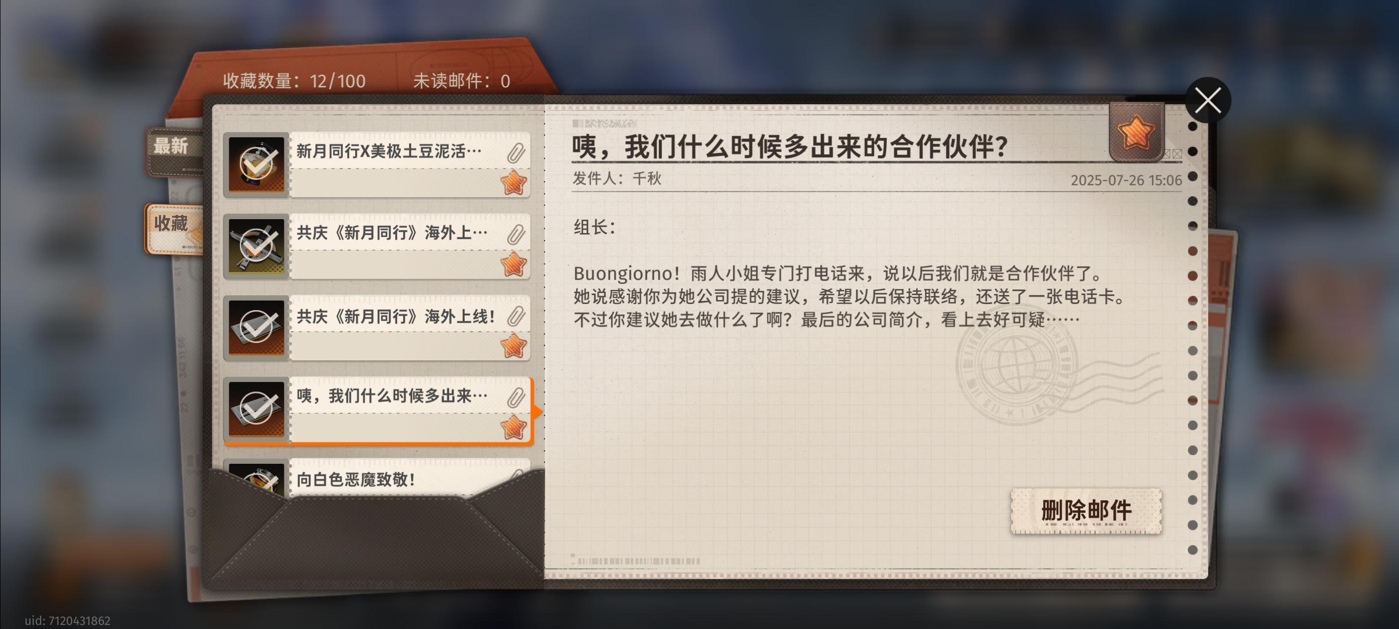 突然就没了……本来看到邮件奖励的时候还挺开心的说,奖励不知道为什么挺丰富的说……但看完内容以后就明白了……准备停更了……这样的停更消息,来得似乎没有一点预兆……这刚过完一周年就私了……挺感慨的说美术挺好的,剧情也是可以说越来越好,今年的新年剧情把折镜刻画的超好的说,还期待明年的新年剧情来着算啦~多的就不说啦,祝我们好聚好散~有缘再聚叭,希望不久你们可以拿出更能打的新游 继续陪伴着我们Cia
