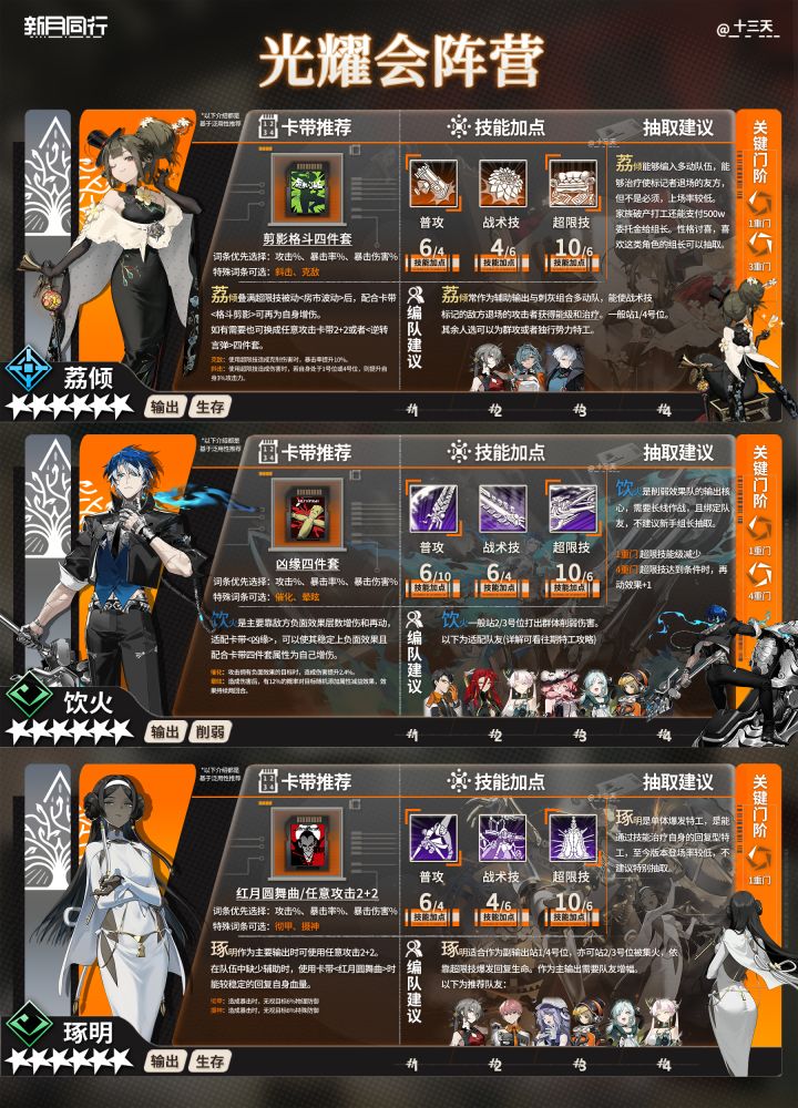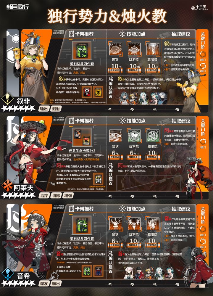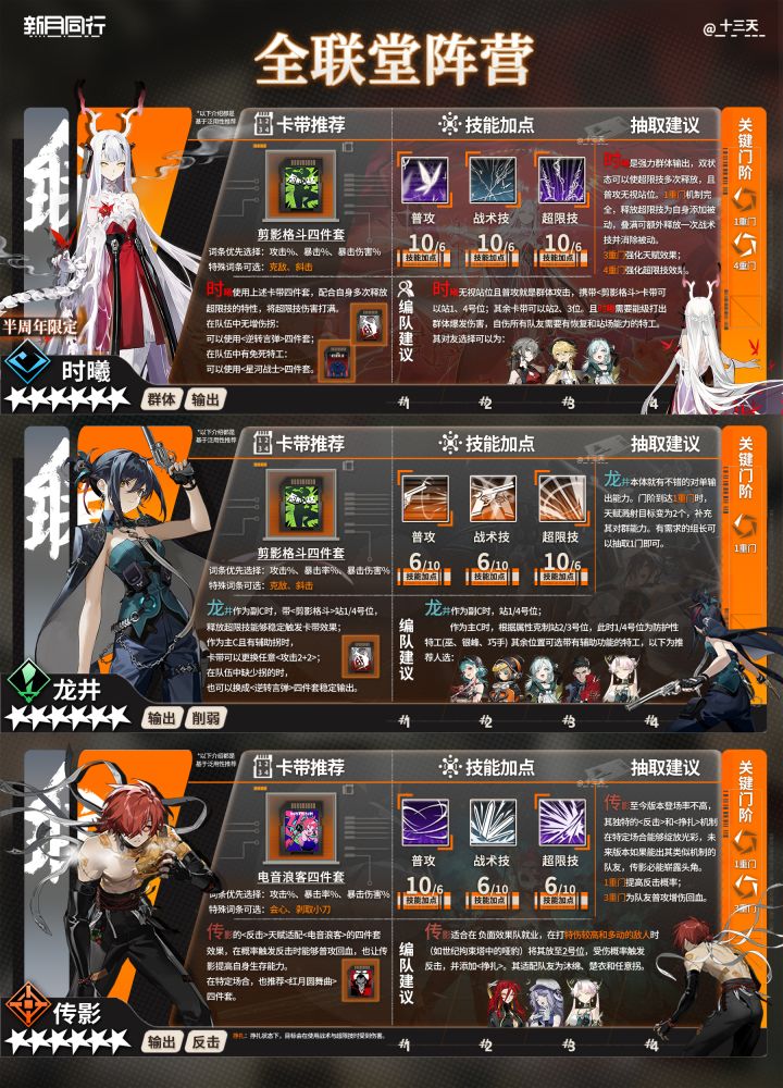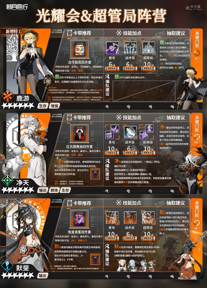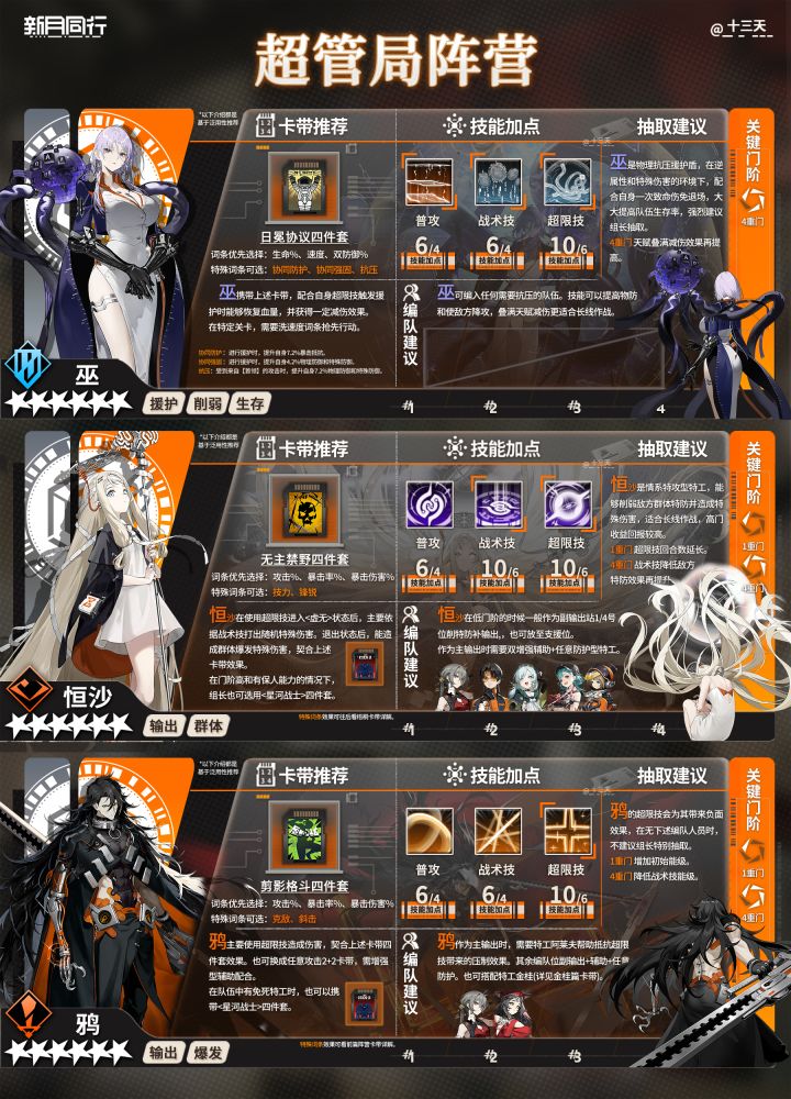 各位组长大家好~我是小天,时间过得真快,突然开服半年了,祝新月同行半周年快乐~不知道大家对半周年活动感觉如何,都抽到心仪的特工了吗?欢迎评论区告诉我~ 随着半周年开启,更多新人组长到来,小天爆肝了开服至今(半周年)全六星养成一图流攻略及配队公式,请各位新老组长鹅查收~ *以上特工排序不分先后,攻略制作不易,禁止抄袭搬运,谢谢配合。 | 卡带推荐 | 基于泛用性推荐,部分特殊词条不必