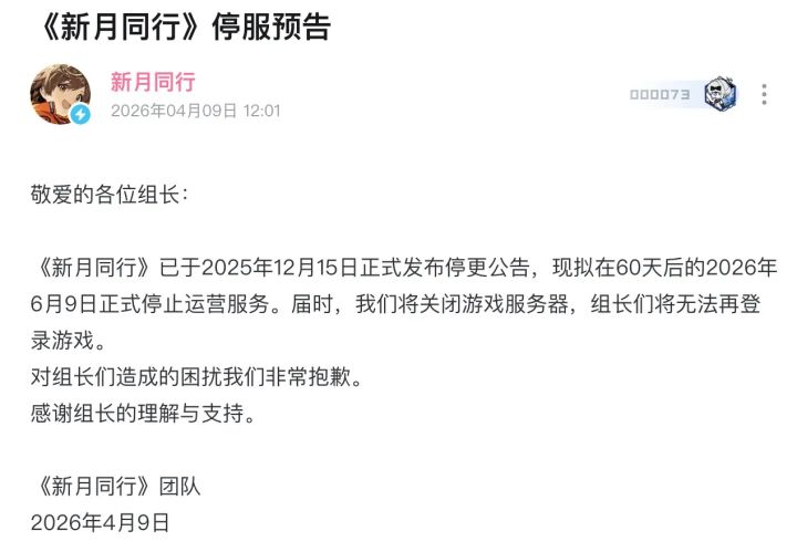4月9日,超自然都市题材二次元手游《新月同行》正式发布停服公告,宣布将于2026年6月9日终止所有运营服务。这款游戏自2024年10月24日上线,至今运营仅1年5个月零16天,上线刚满500多天便迎来落幕,令不少玩家惋惜。