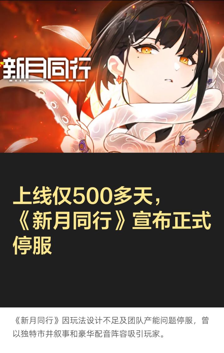 2026年4月9日,都市超自然题材手游《新月同行》官方发布公告,宣布将于6月9日正式关闭服务器,终止运营。这款2024年10月上线的作品,从公测到落幕仅500天,令众多玩家惋惜。早在2025年12月,项目组已停止内容更新,关闭充值、注册与下载入口,仅保留服务器供玩家体验现有内容。此次正式停服,意味着玩家将彻底无法登录,游戏数据也将随之清空。官方在公告中致歉,感谢玩家一路陪伴。作为二次元赛道又一