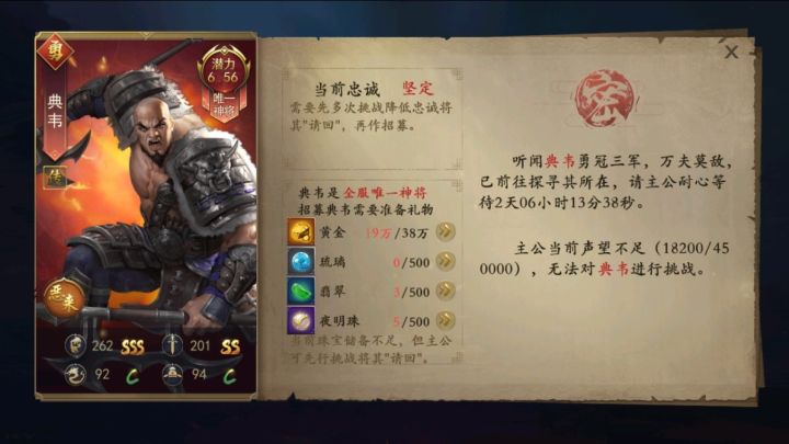 典韦,曹操手下的名将。典韦臂力过人,可以单手举起旗杆,在《三国演义》中,被曹操称为“古之恶来”。典韦作为曹操的护卫,在张绣叛变的时候,率领十余人抵挡叛军,让曹操安全逃脱,自己则因寡不敌众而战死。事后曹操设祭筵痛哭典韦。在《锦绣江山》中,典韦保持了勇猛的形象和属性,非常能打,典韦是全服唯一神将,一旦招降了就会成为该君主独有的将领。【传记】:曹操部下武将,形貌魁梧,臂力惊人,与吕布交战时,从烈焰