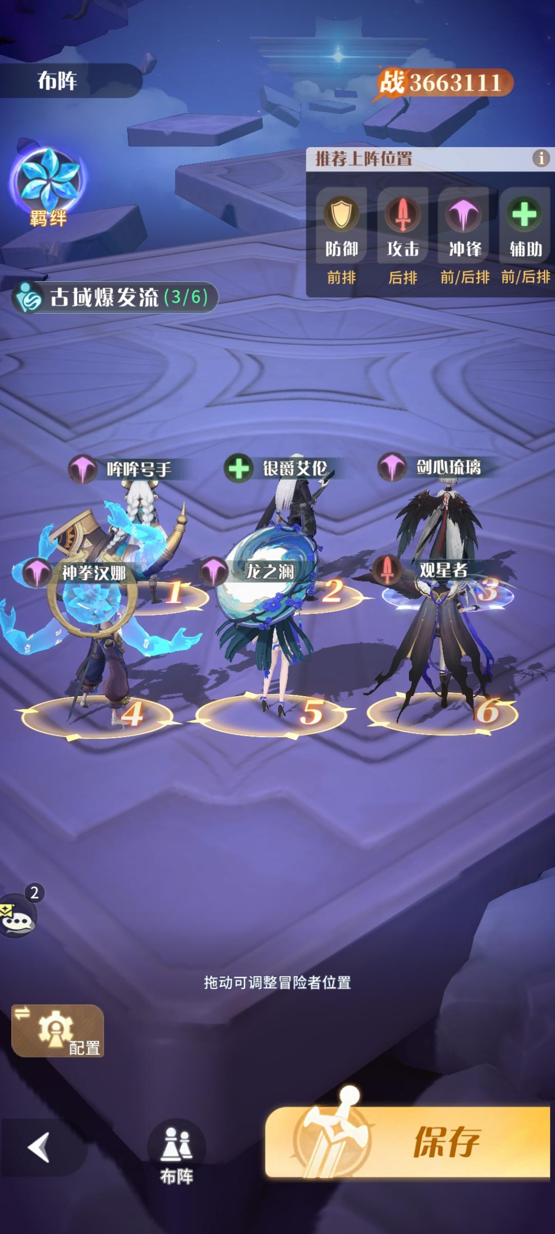 关于阵容推荐或者武器搭配一类的攻略内容 【淚流某個海】【游戏uid 400030276】【天威星3服】 前言:氪佬無腦5幻6氣,平民玩家隨心所欲;而我屬於後者,咱們玩游戲,不要被游戲玩 看起來三國鼎立,實際上“氣”壓山河!官方主打三套陣容,如果做不出平衡,相互剋制,相信很快就涼了 正題:阵容推荐(沒啥好推薦,就玩自己喜愛的) 個人主羈絆漠北,之後打算轉5漠北3萬毒 別小看漠北皇后,身爲補助,傷害不