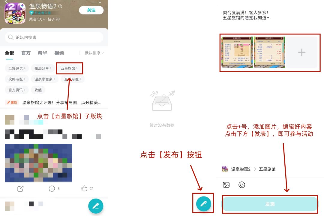 听说经常拿奖杯的五星旅馆不仅客流量很大,契合度也很高哦!各位超会建设的小店主们会有着什么样的精彩信息呢?快来截图分享让大家眼前一亮吧! 即日起至1月27日,在论坛【五星旅馆】子版块下,分享自己的温泉旅馆信息截图(截图位置:【菜单-信息-旅馆信息-任意页】),即有机会领取精美好礼!我们将挑选2位旅馆店主,送出精美周边立牌一份! 〓活动时间〓 2023年1月18日-2023年1月27日 〓参与方式〓 在