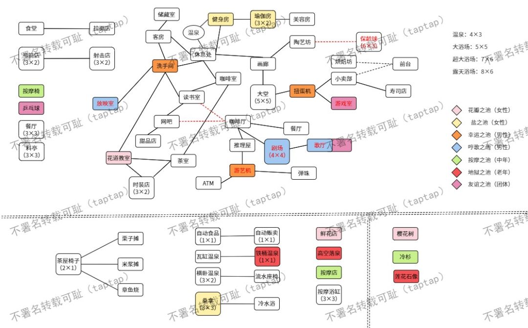 做了个思维导图状的设施相性图,方便搞自己布局时连连看。中后期设施开得差不多了,感觉抄布局有点无聊,还是自己琢磨琢磨好玩。 客房和客房的匹配就省略了。 上半部分是室内设施,下半部分是室外设施。 非基本大小(2×2)的设施注明了大小。 普通黑线是契合度提高的搭配,红色虚线是契合度低的搭配。黑色虚线设施可放在前台附近,住客早上退房的时候也会使用。 红字设施会降低客房契合度。 不同背景色的设施与特定的温泉