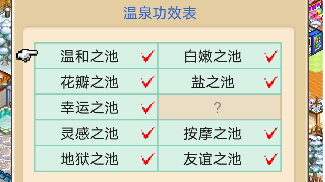 目前尚未通关,一边摸索一边玩,有什么问题欢迎一起交流呀~ 一、契合度词典补充 1.点心店+网吧 年轻、中年顾客上升 2.读书室+网吧 年轻顾客上升 二、温泉功效 白嫩之池、灵感之池挖掘土地就可以获得,不需要用设施堆砌,挖掘后每个温泉池都有 三、契合度 1.客房包括西式、和式两种,契合度词典中部分搭配中的“客房”指两者都可以 2.由于翻译问题,推理室=占星/占卜室 四、景色/人气 1.人气由景色、设