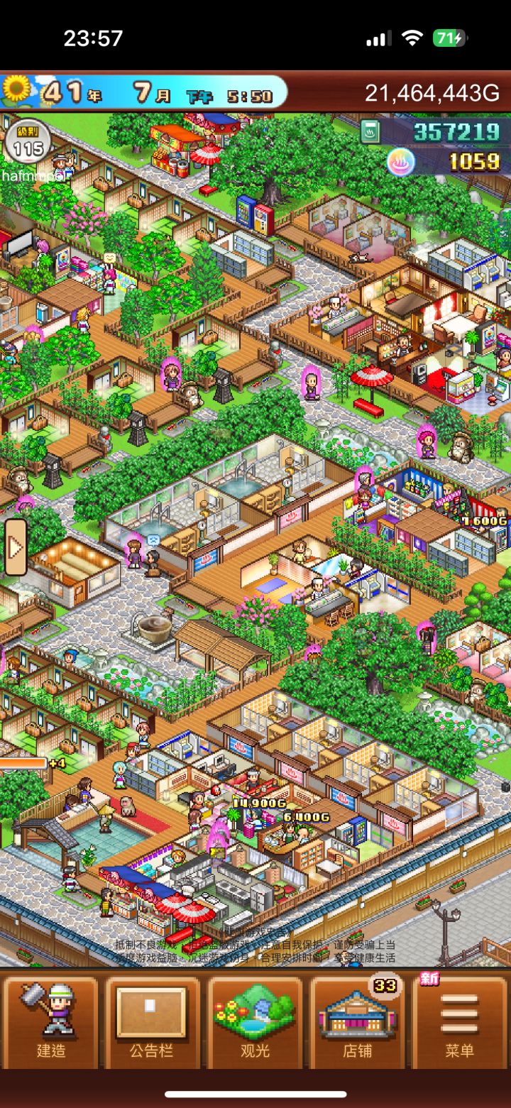 中后期布局的小探索~这次布局先温泉效用拉满,再看别的怎么摆,店铺相关相性基本都有了。买一堆石像,加上房间投道具,房间500已满。温泉有了旁边的冬青,茶花,樱花,温泉分数也满了。十九年还没五星,主要是员工没招够,升级不足。餐厅数量可能没够,没到分,开了餐厅再看看。#游戏图文新春挑战#攻略