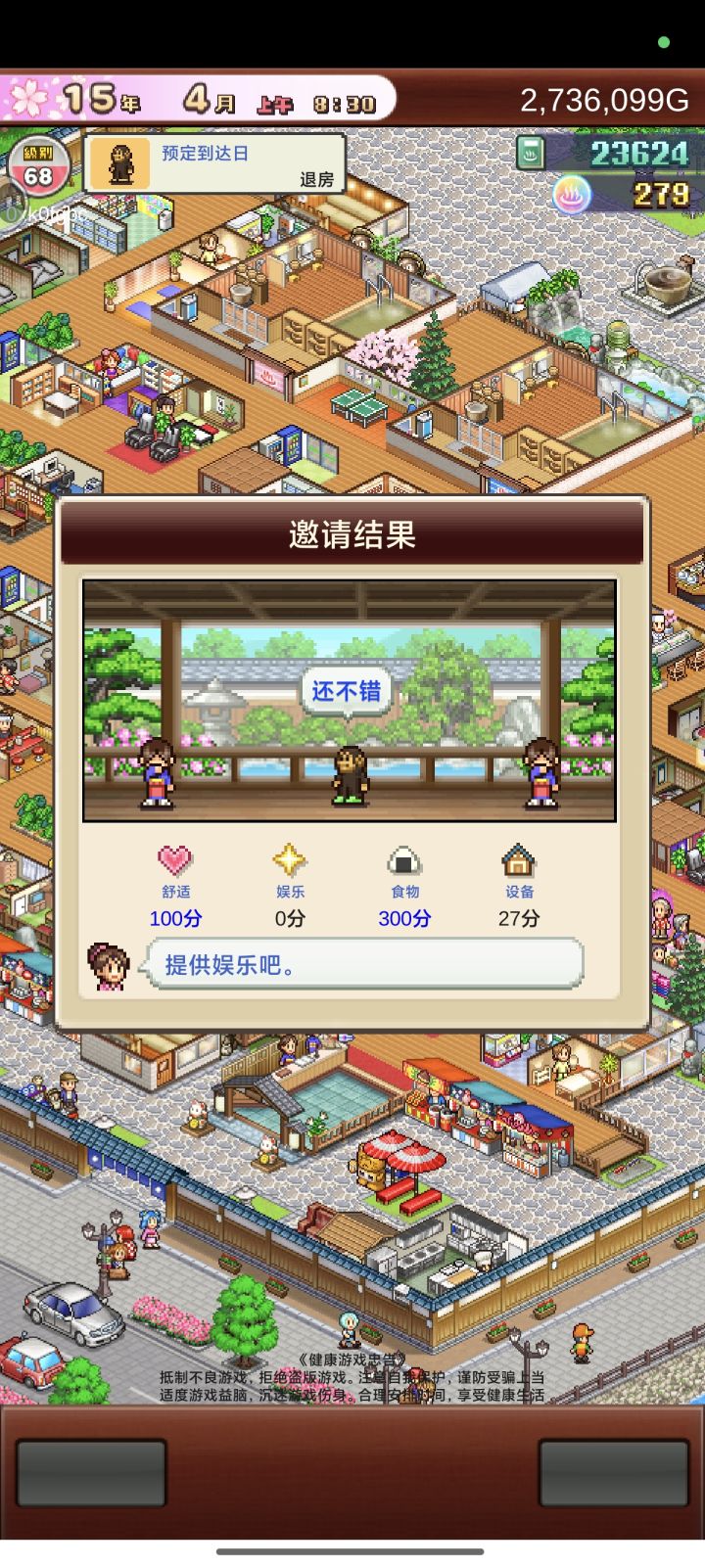 中后期布局的小探索~这次布局先温泉效用拉满,再看别的怎么摆,店铺相关相性基本都有了。买一堆石像,加上房间投道具,房间500已满。温泉有了旁边的冬青,茶花,樱花,温泉分数也满了。十九年还没五星,主要是员工没招够,升级不足。餐厅数量可能没够,没到分,开了餐厅再看看。#游戏图文新春挑战#攻略