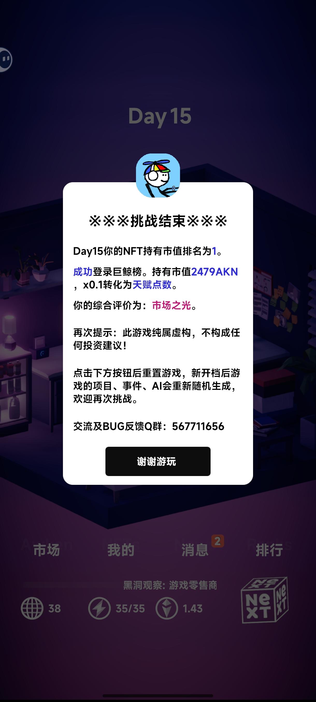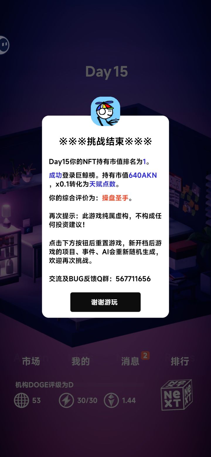 一开始进入游戏看到全是英文可能会有点玩不明白,但是多玩几局你就会发现其实不是很难,玩几局后你会发现哪几支会飙升,所以最重要的是前期积攒影响力,通过抛售NFT积累原始资本,然后全部做空,找那几只优质NFT,梭哈高品质的,低的没有价值,后面只要微操就行了,稳定第一,就是可能会直接进入巨鲸榜,吃不到第一次进入新人榜给的精力。