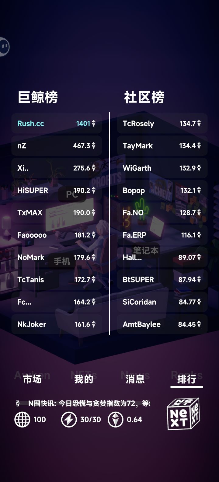 2周目进去直接超低价扫货,能买多少买多少,还是持有不动,体力值全换成影响力去拉盘做多就能上巨鲸榜了