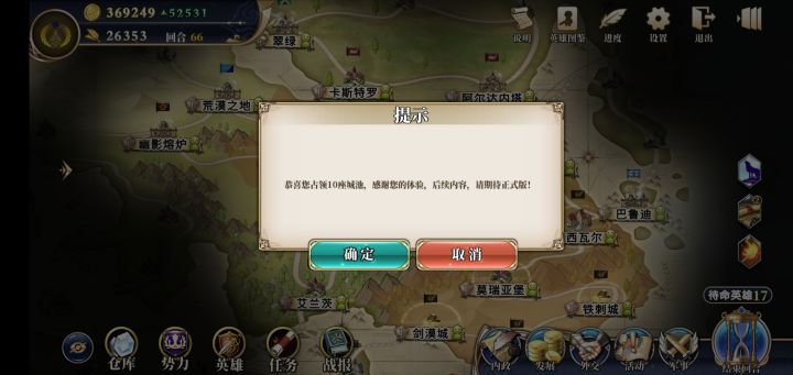 因为测试版占领10个城就会结束游戏,等于变相的限制了玩家不能无脑平推统一,然后就有了一些正式版没有的邪道技巧。1,养傀儡国。这个估计玩家都试过了,打下的城丢给傀儡国,保持本国城市不超过9个就可以全灭其他势力。2,万里钓鱼。眼馋某个国家的强力英雄但是太远打不到怎么办?很简单,外交送他一个城(送城是100%成功的),然后反复刷这个城因为游戏机制,英雄守城是无视距离的,你送的城离他的根据地很远也一样