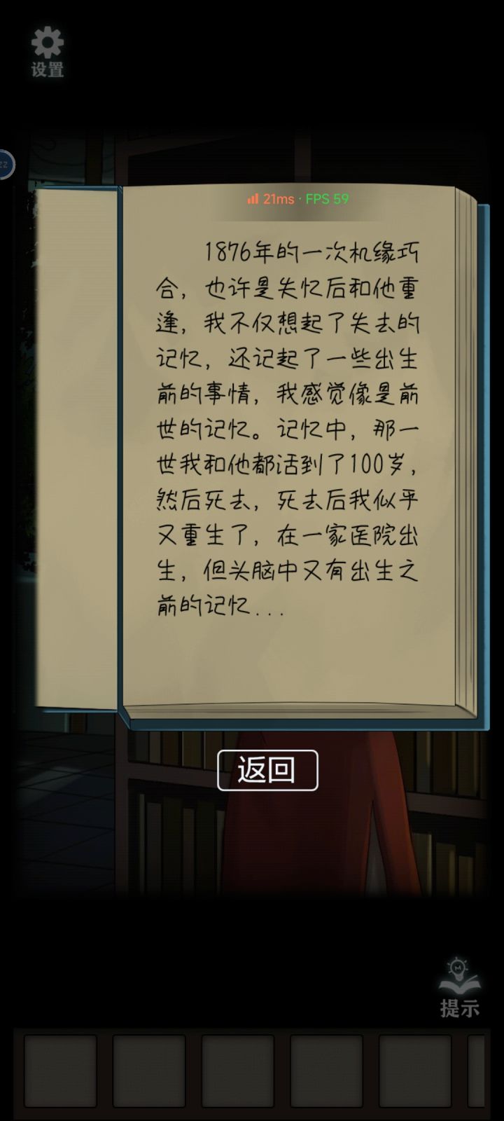 攻略作者:迷失攻略组-钳子未经许可,禁止转载,侵权必究!✅详细视频速通流程攻略:41.移动左侧的盆栽,获得风景画方块。4142.查看书架上的书,右转,将落地钟的时间调整至12点,获得一个石盘,将三个石盘装到右侧柱子上。421、422、42343.回到楼梯口,查看右上角的风景画,将两个方块装上去。4344.根据书柜中纸的提示得知,墨水会按照白绿红黑的顺序变色,也就是照片中顺序越靠后的颜色