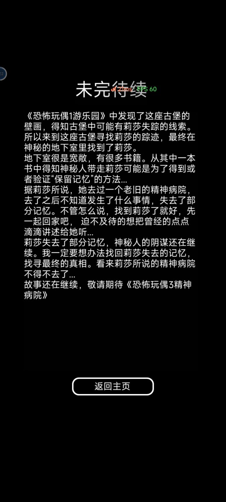 ✅游戏名:《恐怖玩偶2古堡》.✅平台:IOS|Andriod.✅关键词:暗黑童话|剧情解谜|密室逃脱.✅时长:1-2小时.【故事梗概】故事接着《恐怖玩偶1游乐园》往后延续,女友莉莎失踪多年,男主追寻她的下落,终于在怪异密室中的壁画里找到了她的身影,他来到了壁画中的这座古堡,历经千辛万苦终于找到了她,可她却失去了部分记忆…….【浅评一下】游戏剧情很简单,和1相比解谜难度降低了