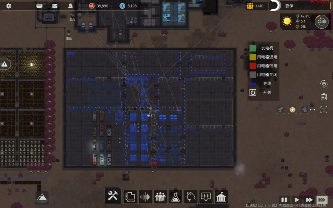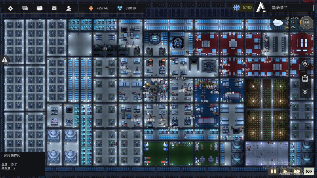 基地室内分布: 1.原料区,2.工厂,3.药品食物,4.储物箱(装备),5.畜牧区,6.钓鱼存储区,7.发电,8.垃圾,9.休息,10.医疗,11.餐厅,12.娱乐区,13.家具存储区,14.运输区(+空艇,贸易),15.尸体区 原料和工厂放一块,增加离线收益; 电力放中心;垃圾区在电力附近; 休息室在工厂旁,减少通勤; 娱乐和餐厅在休息室旁边; 设计规格是 16 个人同时起居的末日避难所; 最后