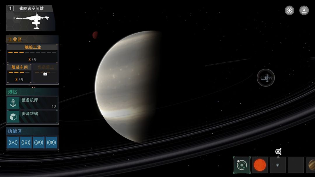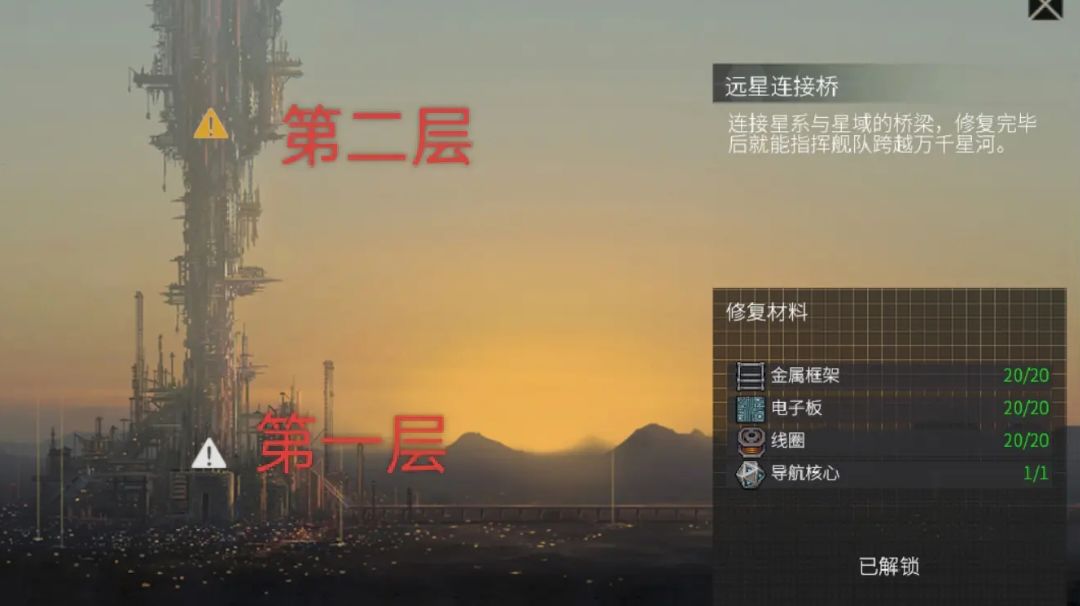 三、太空篇 1.怎么才能上太空? 维修初始地图上的电梯(两层),位于地图中上方,凑齐材料点击维修,耐心等待小人搬运即可 2.上太空能做什么? ①能前往厄斯星系的湍流贸易港购买或出售材料和道具 ②能采集太空中的稀有矿物,此类太空矿是制作部分舰装必不可少的材料 ③能前往其他星球,可根据自身所需材料前往其他星球进行采集或定居 ④能前往空间站制造舰装和舰船 3.如何将小人或物资带上飞船? 点击