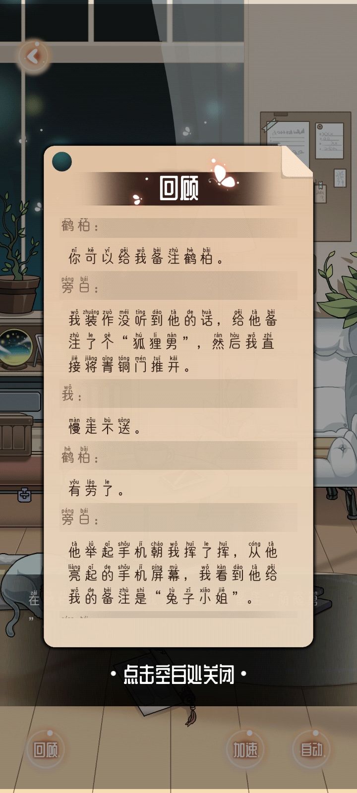 我特别喜欢手机聊天的功能,一是因为里面角色的发言非常生动活泼,相较于话题和氛围比较严肃的主线来说算是一个可以放松缓解心情的地方,二是里面角色回复消息是有时间差的,非常贴近生活,每次我回复什么话,可能需要等几秒才能得到对面的回复,就好像真的有这么一个朋友在和我实时聊天,我需要等对面打字,有时候还会趁等消息的时间切出去在别的页面乱逛。我很喜欢这种感觉。