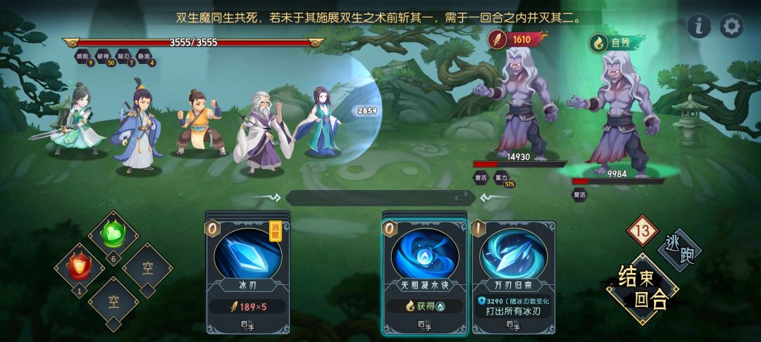 #队伍配置 吕风:技能带两仪,方便根据情况复制冰盾或玄冰;装备无强制要求,有富裕推荐防御装,会更稳。 小师弟:给盾,保证生存,需要2级双防御装。 老头儿:工具人,第一回合加好冰刃就坐板凳了,装备无要求。 风凝:给冰刃加伤,需要2级双防御装。 #战斗回合 第一回合:复制好凝冰到7,不到也没关系,回合数会多一些。 第二至N回合:小师弟加盾,吕风复制盾,躺着攒冰刃! 最后回合:觉得攒够的时候可以手动输出