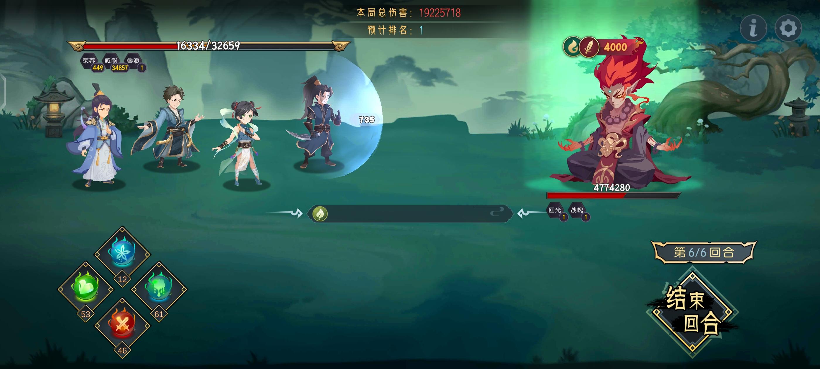 没啥核心点,想得高分就赌云中子(带凝符云天拂)的三清化水不消散。 阵容:天悟(8星最佳)+云中子+柳盈 装备:正常带,血量低的朋友可以给柳盈带个怒火枪。由于每回合会扣血,自己看情况加血保证不死。(等级高了就不用管了,啥都不管也死不了) 【没赌到云中子三清化水时】 第一回合: 云中子3连+复制玄冰化刃X2+柳盈3连(化刃符在玄冰九变之后,就2连。第二回合复制化刃符) 第二回合-第五回合: 柳盈2连+