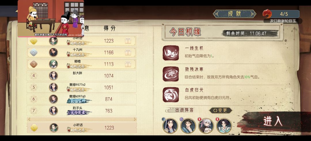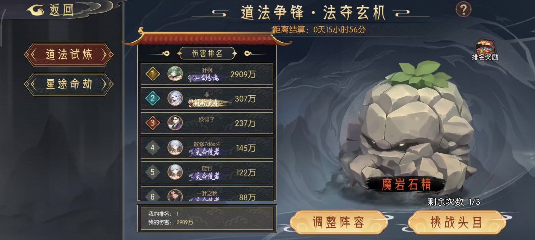这个阵容基本百分之九十五每日挑战都可以用。 两种打打法。 第一种,开局直接加威能,然后主角复制叠浪,第一回合就可以把怪杀死。 第二种,主角复制赵璇儿的玄冰九变,然后第二回合,加威能,主角复制叠浪。 小技巧 1.水灵气不多,那就点屏幕右上方的重来 2.选关卡 装备>技能>那个啥忘了 机缘?, 3.这个分 其实是血量的多少来衡量你最后排名的,所以尽量选加血的装备 就是那个拂尘和靴子, 如果你钱多,没