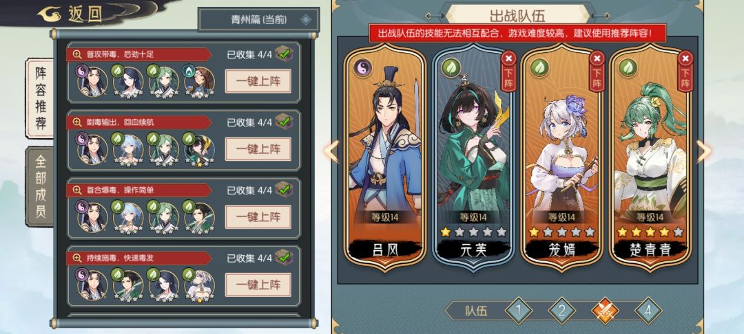 全1星即可,理论上青青是有下位替代的,不过没去实践。 必要条件 1:一件以上幽香衣服 2:主角带法力最高的装备,其次给青青 进入正题 1回合:BOSS必须触发悠长,然后正常叠楚青青的毒,主角复制一下 2回合:主角复制悠长,此时BOSS身上最少9层悠长 3回合:复制青青的10%毒,然后龙焉终结技秒了。 要是伤害差一点就备3个法力丹。简单粗暴,低配中的低配。