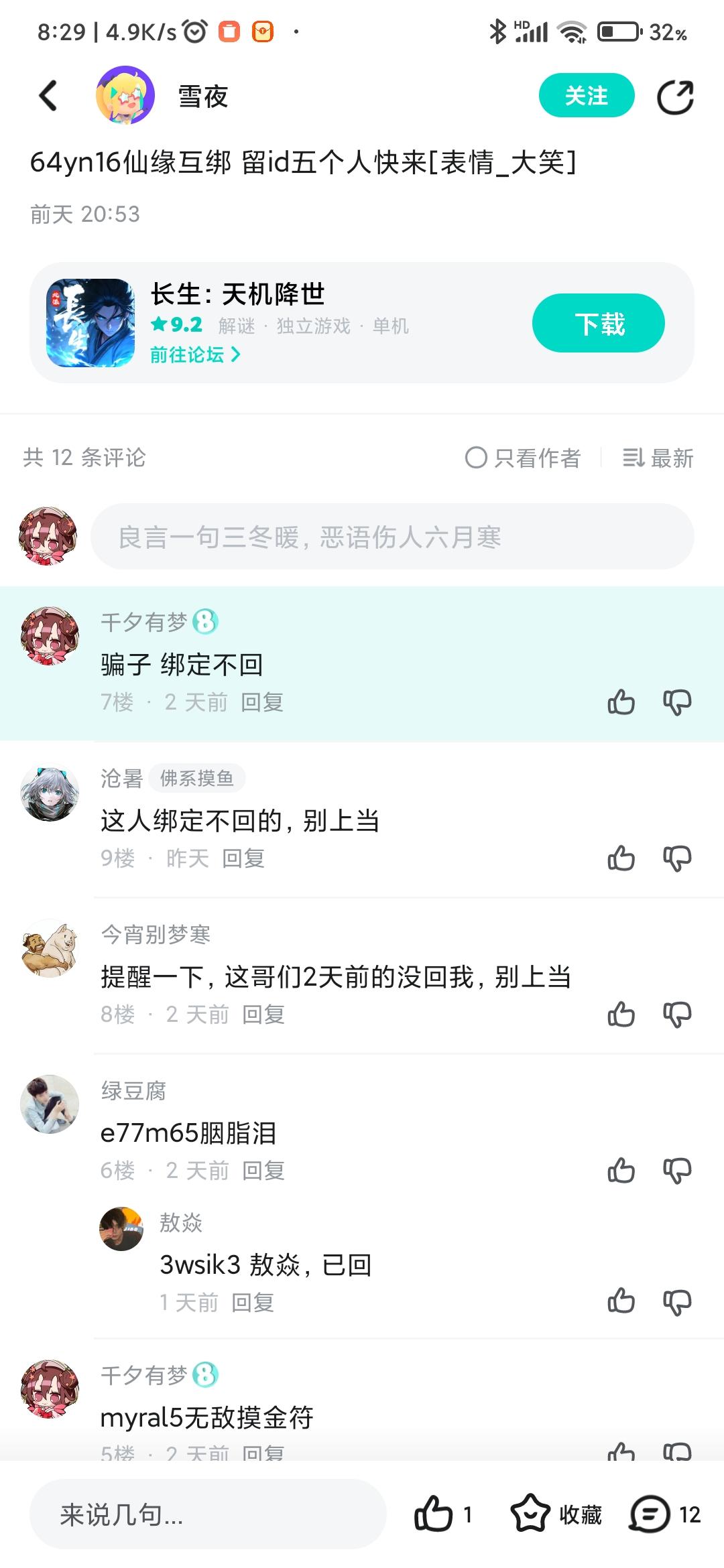 cgow29,仙缘互绑,前五留下名字,诚信回绑。
