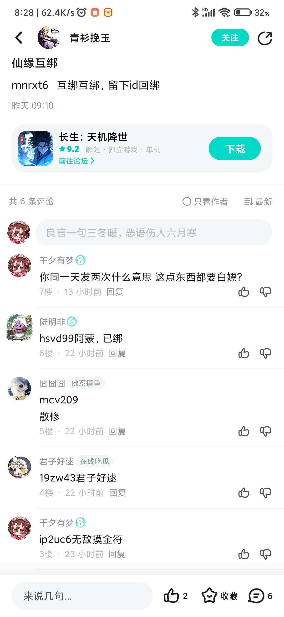 仙缘宝阁,循环开启!参与活动,留下你得仙缘码,有机会0消耗获取道具!更有可能抽到10天命石奖励! 活动期间,每天都会进行一次天命石抽奖!每次抽奖10天命石*20份。3天一开奖。玩家在每日抽奖贴下留下自己的仙缘码,并关注发帖账户以及《长生:天机降世》游戏既可以视为参与。本贴开奖时间为:2026.1.19.10:00【活动奖励】10天命石*20个【活动时间】 1月16日-1月19日【活