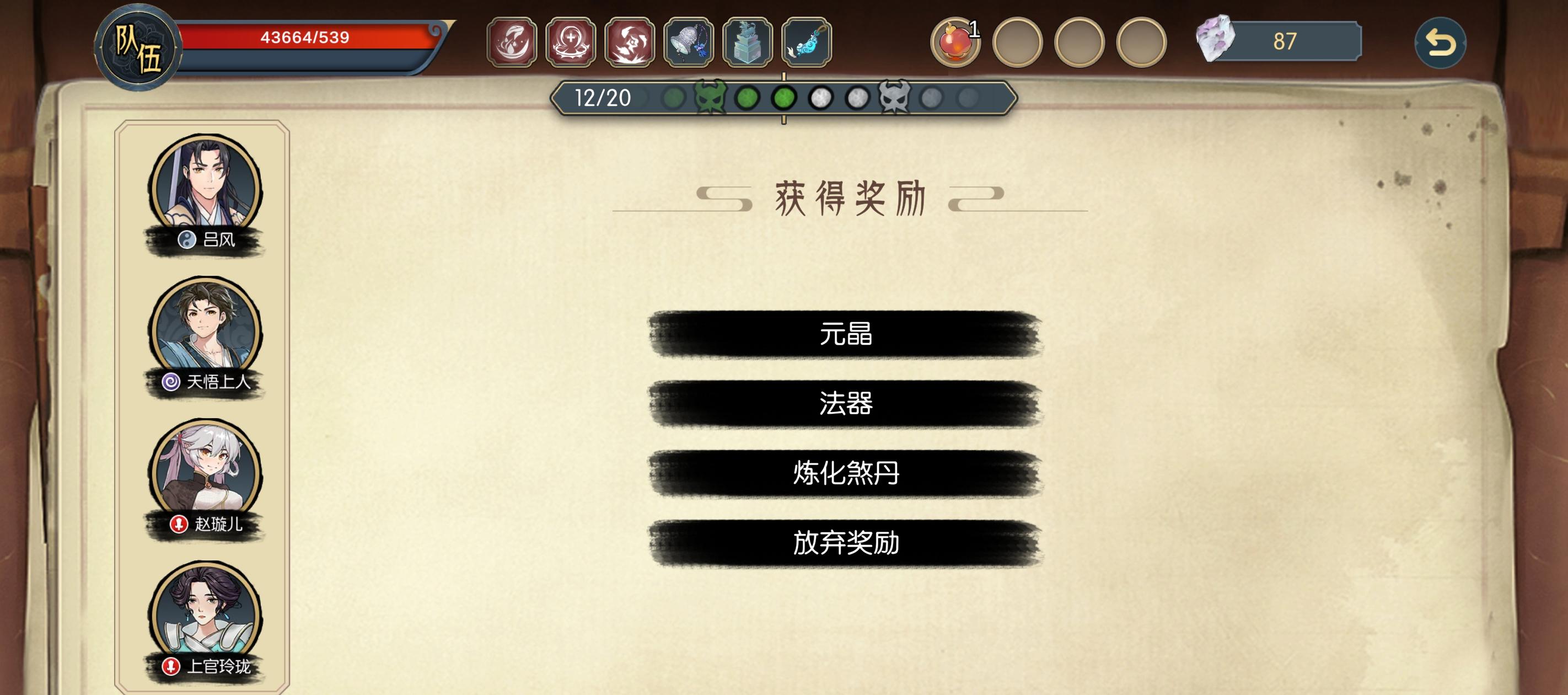 这个主要是提供一个路线选择和拿书思路,越塔可以参考我其他的路线图帖子,不越塔看个乐呵就行了。现在越14第一局第二局傀儡王刷血套,带3朱雀回血1毕方,我只有2个,懒得买了,前面复制涅槃,500涅槃后面挂机等毕方自动加战意,等后面攻击一次能打3分之一血的时候,调成攻击,让对面打死,然后纳兰攻击秒了难度十四收工,准备难度十五第一局第二局两边都得复活才能打,右边能打的小怪多一点,看看打小怪