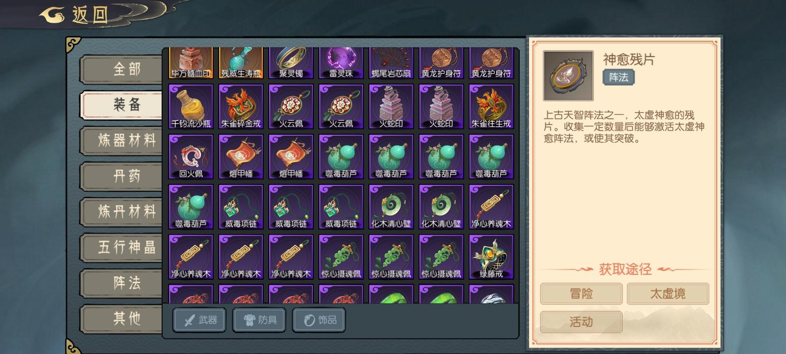 前一二周不太会玩,材料换石头抽卡,后面看攻略才知道要换金饰品。目前玩了近20天吧,饰品只有毕方印,残威瓶。水塔刚过13,木塔12,火塔没怎么爬只有6。刷塔的攻略都说要宝甲,但是木塔不刷毒甲,感觉小兵都不好抗,水塔开头不刷水元素,小兵都不好灌死,前三差不多都到塔15、6了,目前现在还是等级压制都难打,不知道后续怎么爬