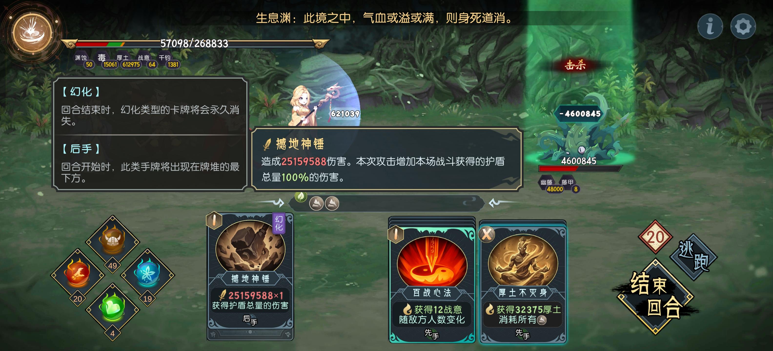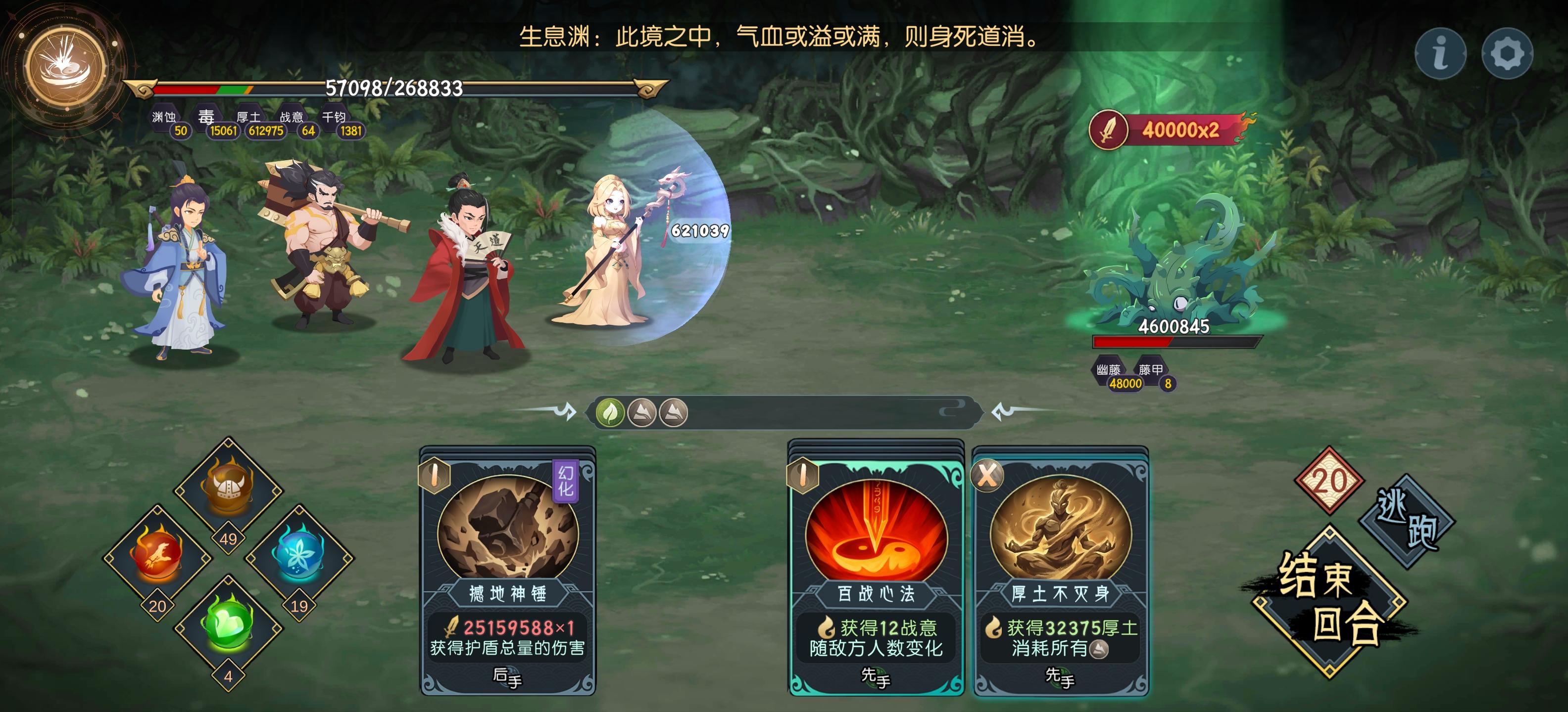 生息渊的打法,应该算邪教吧刚需是噬毒葫芦,有涅槃葫芦更稳,以及全部角色血量装备我是25级,不确定最低多少级能过,等级低的话应该需要噬毒葫芦多一些方便控血开局叠一次厚土,然后放出来涅槃后续根据毒的层数决定用什么,厚土叠到17w怪的物理伤害就打不破了然后第一只怪奶你,后面两只叠毒到自己回合毒不死就叠厚土或者千钧,能毒死就直接跳回合,等噬毒葫芦消毒,盾和千钧叠上来之后用涅槃清毒,然后复制锤的