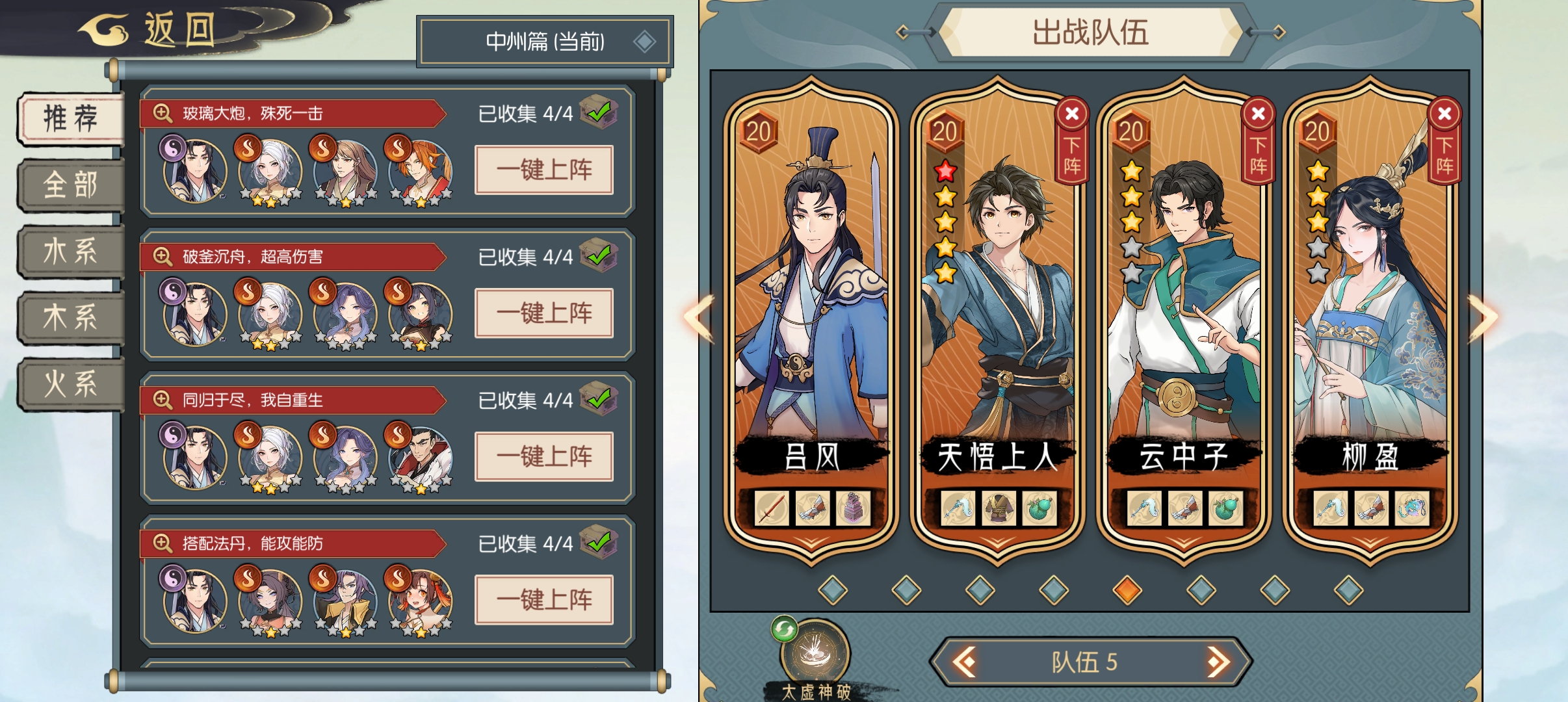 昨天15级卡到这没过去,今天16级按照猫爷的攻略略微调整,使用玻璃大炮阵容极限过去了,因为新手,资源缺,装备差的多,实验了好多次,具体如下: 第一,要保证有乾坤叱妖镯,30几率给随机敌人施加破甲,再加上火蛟佩,给一个敌人施加破甲,加上一个聚灵镯,增加一个灵气,两个战鼓炽晶臂增加21层战意 第二,入场后得满足有两个敌人被施加破甲,且邓卓月衍火诀在上面,就是能产生2个火灵气的技能。 第三,保证