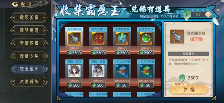目前11级了,卡池一共有200抽了,目前还留着一个自选没用。目前用的水属性的国家队,从开荒的体验来说,这个自选是给水队的慕容月,补个对单的队伍;还是给毒队的鸠真真更好呢,毒队的数值会更强于水队吗?然后这个仙缘宝阁,这一期有值得兑换的吗?以及这个霜玉宝阁,呃,抽了一发十连才意识到不对,这不是新春活动。这个应该不值得抽了吧?不过我比较在意的是有鸠真真的碎片,这个游戏可以通过碎片解锁人物吗?我看送的