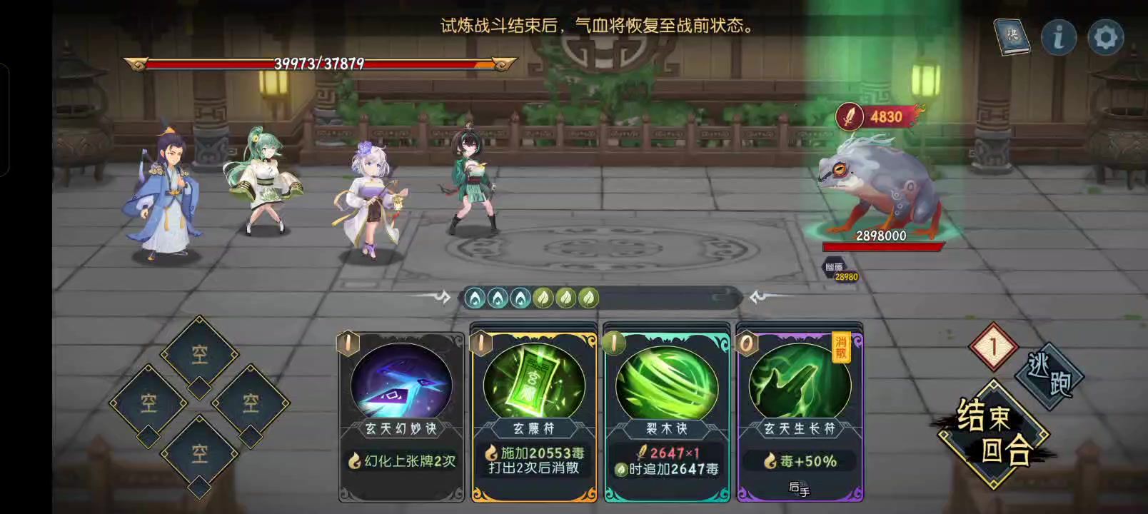 0氪12级打道法试炼轻松打110万伤害,超越一众氪佬,星级要求也不高,12级的阵容,主线打16级小怪也不难,主角带炫天幻妙诀,楚青青元芙鸠真真,装备主角尽量带防御或者血量装,其他三个尽量带法术装,第一回合元芙的技能完全不动,先放楚青青的玄天幽藤符,然后用主角的玄天幻妙诀复制这张卡两次,接着按照顺序用除了元芙以外的技能,最后先用追风诀对毒最多的敌方角色扩散百分之20的毒,然后再用归一诀全部集中到一个