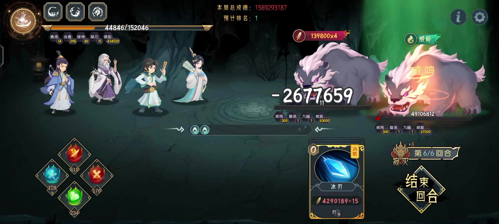 天悟(五星)柳盈,云中子(二星)装备什么攻击高就带什么,天悟带高法强(所有装备无视后续词条白板都行)三个战鼓炽金臂(最好就有,伤害就溢出了)此队可完美通关后续守关BOSS,打法都一样,只要不死就攒着冰刃一轮爆发,第一回合出牌顺序自己把握好,后续没有视频,这队直接用到全主线通关[表情_微笑][表情_微笑] #游戏攻略
