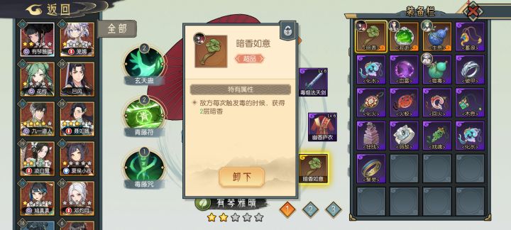 角色20级星级都一星,用乱花葬反复触发低量毒,叠加幽香和玄天蛊,我相信这个阵容的上限