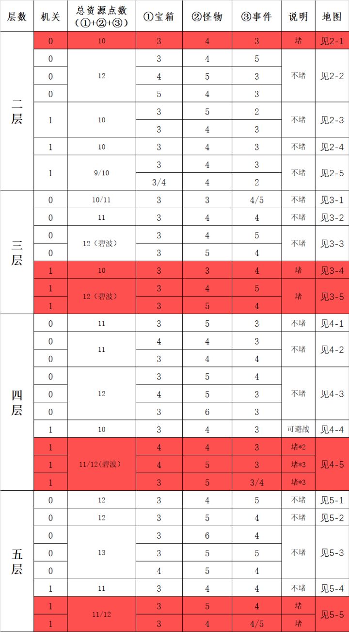 个人统计,如有疏漏,烦请带图指正。地图有两个点位是固定的:①事件【机关】②若以前层数未选择【机缘宝箱】,那么【机缘宝箱】碧波仙子的点位是固定的。若以前层数选择过【机缘宝箱】,那么原【机缘宝箱】的事件位置会出现其他事件。通过以上两个点位,可以大致确定下一层的地图。ps:【以赌会友】阵法师的点位可能机制和【机缘宝箱】碧波仙子相同,但是未经证实。地图中有的资源点位可能随机刷出宝箱/怪物/事件